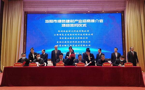 在此次大會上,中國建筑材料工業(yè)規(guī)劃研究院與當陽市政府簽署戰(zhàn)略合作協(xié)議,將把當陽市作為中國綠色建材高質(zhì)量發(fā)展論壇永久會址,論壇每兩年舉行一次。重慶固安捷實業(yè)有限公司等5家企業(yè)與當陽市政府簽訂了招商引資項目合作協(xié)議。